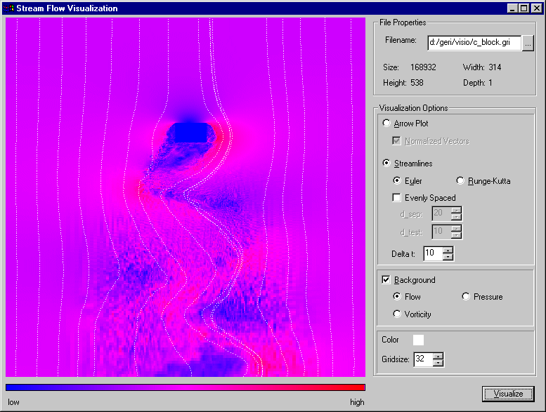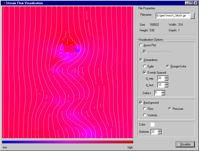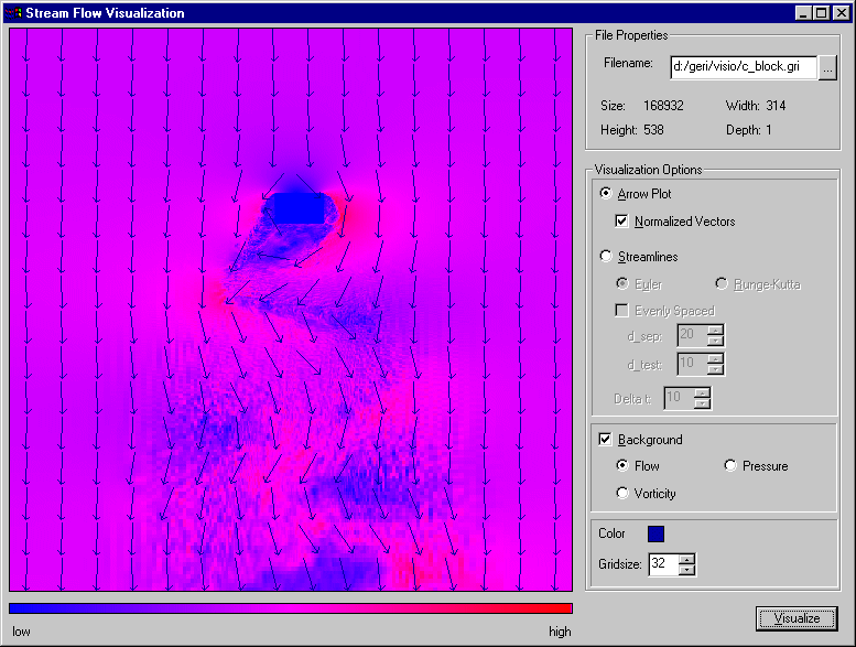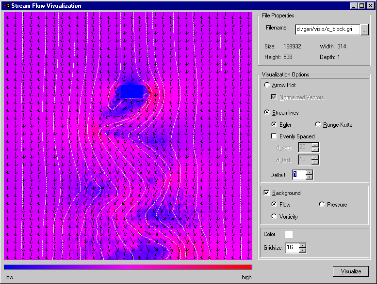 The last screenshot shows an arrow plot with normalized vectors and a grid size of 16. After the calculation of the arrow plot additional streamlines were inserted into the image using the Euler integration algorithm with a Dt of 5. The background once again shows the strength of the stream flow. ![]() |
