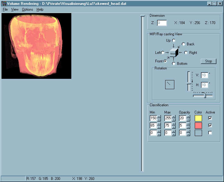 Das Programm wurde so weit wie möglich allgemein gehalten, es sollte daher auch mit anderen Datensätzen funktionieren. Eine Einschränkung ergibt sich durch die maximale Größe des Datensatzes auf 184x256x170.