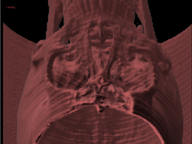 After starting the program (just double- click on the Raycast.exe file in Windows) there will be a window with only the message that no file has been loaded yet. Just type l (load) and after that type in a filename (eg c:\skewed_head.dat) and press Enter. When the file is loaded the message ready will be displayed. Now you can type the following commands: