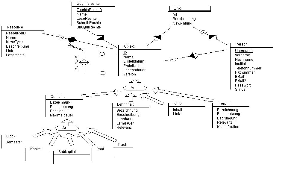 Des Weiteren sind Objekte in Inhaltsobjekte (Lehrinhalte, Lernziele, Notizen, etc.) und Container (Blöcke, Kapitel, Subkapitel, etc.) die wiederum Objekte enthalten, aufgeteilt.