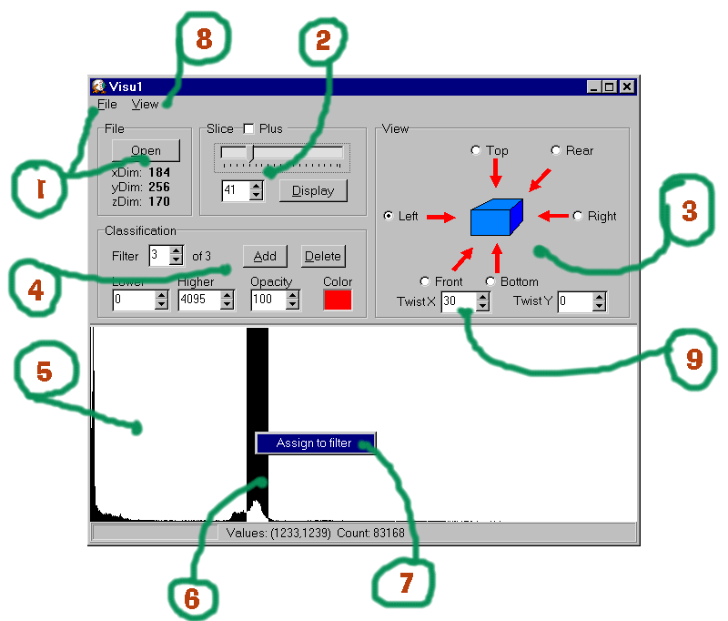 Nach der Auswahl eines Bereichs im Histrogramm (6) kann durch klicken mit