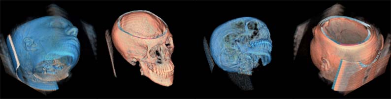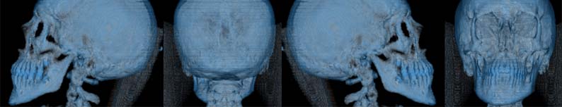 Damit man auch das Innere, nicht nur Haut, visualisiert, ist es oft nötig den Schwellwert der Dichte eistellen. Das heißt, daß alle Dichtewerte, die kleiner als dieses Schwellwert sind, werden ignoriert. Wenn man z.B. Schwellwert auf 1500 einstellt, werden meistens nur Knochen und Zähne sichtbar. Das ermöglicht der Parameter -t: -t1200. Default ist 0 eingestellt.