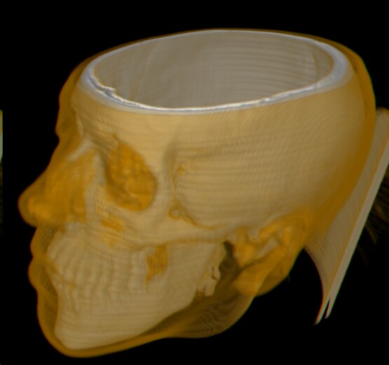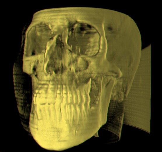 Zum Download des Programmes gibt es diese möglichkeit. Weiters braucht man dazu ein CT-Datenstatz im richtigen Format: "16 Bit pro Datenwert (aber nur 12 Bit in Verwendung). Das Datenformat besteht aus 6 Byte header (read xDim; read yDim; read zDim; - jeweils 2 Byte) und den Daten (for z = 1 to zDim; for y = 1 to yDim; for x = 1 to xDim; read data[x][y][z]; done; done; done; - jeweils 2 Byte, aber nur 12 Bit verwendet)." So ein Datensatz ist z.B. diese, der auch für das Erstellen der Beispielbilder verwendet wurde. Viel Spass beim Ausprobieren. Technische Details: Beim Rendering wird das Bildfläche von links oben nach rechts unten zeilenweise abgetastet, und für jedes Punkt ein Strahl in die Z Richtung gelegt. Entlang dieses Strahles werden von vorne nach hinten samples genommen (Auflösung ist ein pixel). Abgebrochen wird das verfahren dann, wenn man ganz hinten im abtastbereich angelangt ist, oder wegen der zu kleinen Restdurchsichtigkeit (ist 0.008) nicht mehr weitergegangen werden muss. Die so genommenen Samples werden dann mit dem Ausgewählten Shading belegt, und zu einen Color für das jeweilige Punkt aufsummiert. Im Preview Methode passiert exakt das selbe, mit einer in jede Richtung halbierter Auflösung, und einen gröberen abbruchbedingung für die Durchsichtigkeit (0.05). |