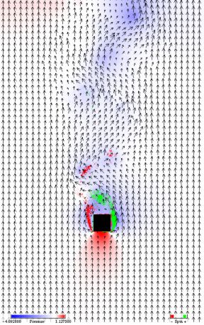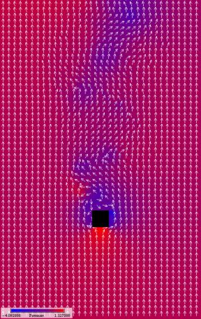 An arrow plot technique is used to visualize the flow. The arrows can be viewed at equal length or depending on the flow velocity. The impression of what's going on can be increased by visualizing the pressure and the spin in the background of the image. It is possible to change the coloring of the pressure. The program takes any .bmp file and uses the first 256 color entries as color table from lowest value to the highest. This feature makes the program extremely flexible because very complex color tables can be generated using any image editing software.