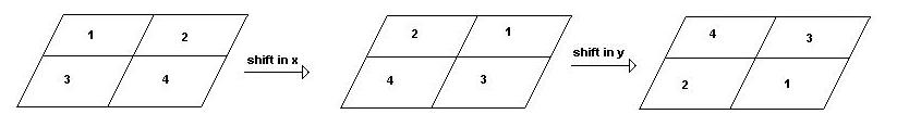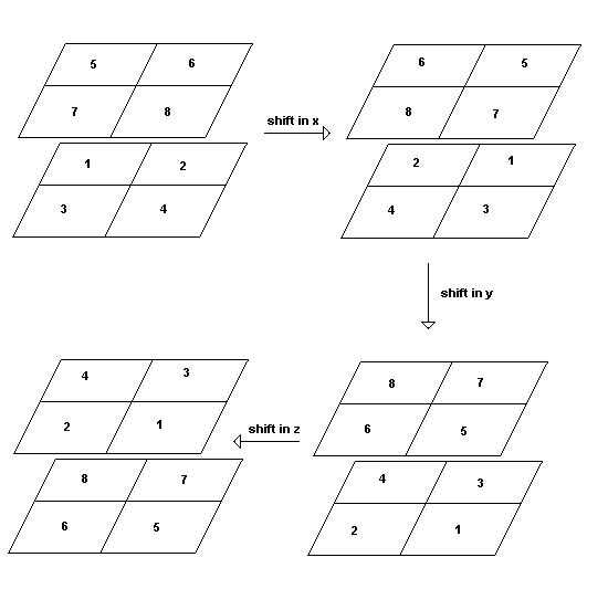 Im nächsten Schritt ist es nun unbedingt notwendig, einen zyklischen 3D-Shift zu machen, damit der Ursprung des Datenwürfels genau in den Mittelpunkt verschoben wird (sonst wäre er ja an der Stelle [0][0][0]). Nun erfolgt die eigentliche 3D-Fourier-Transformation. Der vorangehende 3D-Shift muss nun wieder rückgängig gemacht werden (also ein zweites Mal angewendet werden). Somit nun ist der Preprocessing-Schritt, der nur ein einziges Mal nach dem Laden der Daten durchgeführt werden muss, abgeschlossen.