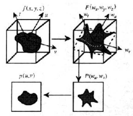 Abb. 1: Prinzip des FVR. In der Skizze links oben sieht man die Daten im Ortsraum. Diese werden in den Frequenzraum transformiert (oben). Die Daten im Frequenzraum entsprechen der Zerlegung eines Signals im Ortsraum in seine Frequenzanteile. Dann wird auf eine beliebig rotierte Ebene orthogonal zur Blickrichtung durch den Ursprung gelegt (rechts oben) und diese Ebene (rechts unten) wird wieder zurück in den Ortsraum transformiert (unten). Dieser Vorgang entspricht genau der Projektion der Daten im Ortsraum auf die Ebene orthogonal zur Blickrichtung.