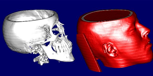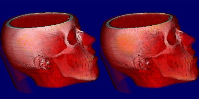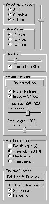 | The Algorithm | Raycasting: First the volume data is transformed into an orthogonal grid. After that the shading and the transparency information is generated from this data using user defined parameters mentioned above in the "Features" section. For every pixel drawn there is a ray casted into these data sets from front to the back. The accumulated value is used for the pixel color. |