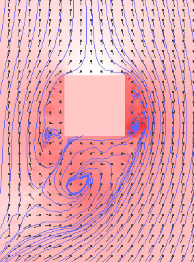 The program is able to load a grid-file and the linked data-file and provides some methods to visualize the flow of a liquid that is blocked by a barrier.
