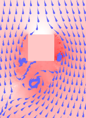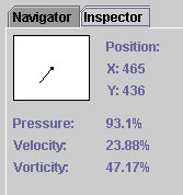 | The inspector shows the data values at the mouse cursor (in percent of the range [min..max]) and a velocity scaled pin arrow, to visualize the direction of the flow. | ||