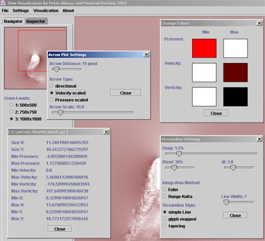 FlowVis in action. You can see in this picture the navigator tab and the viewport in the background, and all the dialogs in the front. |