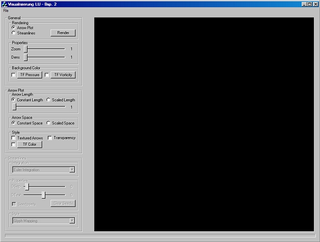 | Um einen Datensatz zu laden muss zunächst das Menü "File" geöffnet und der Menüpunkt "Load *.gri" angewählt werden. Im daraufhin erscheinenden Dialogfenster muss der gewünschte Datensatz ausgewählt werden. Anschließend muss noch ein "*.dat"-File geladen werden, auf welches durch den Menüpunkt "Load *.dat" zugegriffen wird. Nach dem Laden bleibt das Programmfenster zunächst schwarz, bis ein Renderverfahren ausgewählt wird. Zur Verfügung stehen Arrow Plot und Streamlines | ||