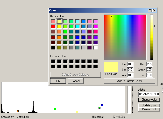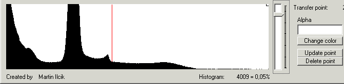 1D Histogramm lässt sich mit dem Slider rechts vom ihm zoomen. Neue Punkte werden mit Doppelklick auf die gewünschte Position generiert. Jedes Punkt lässt sich mit der Maus herumschieben. Rechtsklick ermöglicht Parameter des angeklickten Punktes rechts vom Histogramm zu editieren oder den Punkt zu löschen. Die höhe des Kontrollpunktes symbolisiert seine nichtdurchsichtichkeit. Je höher, desto weniger durschsictig sind die Kontrollpunkte.