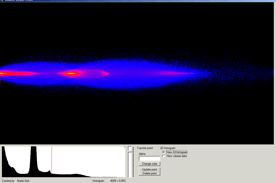 Mein Programm behandelt nicht Daten, die nicht durch Dreiecke (also nur oberflächllich) definiert sind. Es arbeitet mit Volumetrischen Daten, die auch den Innenraum des Objekts füllen. Man kann auch hier keine beliebig große Präzision erreichen. Die input Daten sind in einem regulärem 3D-Gitter gespeichert. Schon ziehmlich kleine Datensätze können riesen groß werden. Meine software solle mit sehr großen Mühe 512x512x96 schaffen. Die verarbeiteten Daten beinhalten keine Farbeninformation, nur einen helligkeitskanal mit 12-bits pro Voxel. Das reicht in meisten fällen und die populärste Methode zur Volumendatengewinnung – Computer tomographie liefert sowieso nur graustufen Bilder. Die Volumendaten werden also in dem Speicher geladen. Dabei werden gleich auch die Gradienten für Voxel berechnet und ein Histogramm der Helligkeitswerte erstellt. Die eigentliche Visualisation geschied mittels Raycasting. Aus dem Auge werden Strahlen durch Projektionsebene in die Szene gefeuert. Es werden nur die Strahlen geschossen, die das Volumenobjekt duchscheiden werden. Ab dem ersten Schnittpunkt des Strahls und des Objekts werden dann in regelmässigen Abständen Helligkeitswerte des Objekts genommen, ewentuell durch eine Transferfunktion R->R4 verfärbt und zusammengezählt. Nachdem die Alphawerte (Dichtewerte) nichts mehr durchlassen, wir der Strahl gestoppt (compositing mode). Man kann aber auch alle Stralen durch den ganzen Objekt laufen lassen und danach den Farbendurchschnitt für jeden berechnen (averaging mode). So bekommt man einen Röntgenbild. Noch ein Wort zu den Transferfunktionen: 1D Transferfunktion bildet Helligkeit in RGBA Farbe, 2D Transferfunktion bildet das Tuppel Helligkeit und Gradient in RGBA farbe. Die Transferfunktionen sind durch einige Puntke definier, zwischen denen linear interpoliert wird.