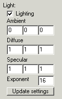 Das Objekt lässt sich mit Phong Illuminationsmodell schattieren. Dazu ist möglich, die ambienten, diffusen uns spekularen lichtparameter einzustellen (Werte von 0 bis 1).