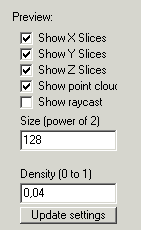 Was zu zeigen ist und was nicht lässt sich in der Kategorie Preview einstellen. Mit show raycast schaltet man das software raytracing ein. Die Daten werden in niedrigen Auflösung gezeichnet, um realtime Manipulation zu ermöglichen. Die Auflösung und Dichte der Samples lässt sich einstellen.