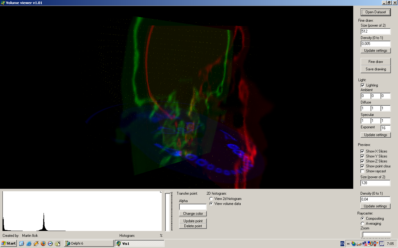 Ich habe dieses Software für die Laborübung „Visualisierung“ Porgrammiert. Volumenvisualisation war das erste Beispiel. Die ganze Zeit habe ich gehofft, den Algoritmus teilwiese auf GPU übertragen zu schaffen. Leider Blieb mir keine Zeit dafür. Die neuen Grafikkarten mit ShaderModel 3.0 zeigen sich als sehr gut dafür geeignet. Na ja, villeicht bleibt mir in den Ferien bisschen Zeit dafür.