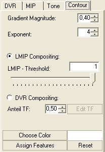 Des Weiteren hat der User die Möglichkeit zwischen LMIP Compositing und DVR Compositing zu wählen. Wählt er LMIP Compositing, so kann er den Intensity Threshold für das LMIP Compositing Model festzulegen (default: 1). Wählt er DVR Compositing, so hat er die Möglichkeit durch klick auf den Button "Edit TF" eine individuelle Transferfunction im sich dann öffnenden Dialogfenster zu erstellen. Die Farbe aus der Transferfunction wird dann beim rendern mit der Farbe aus dem Contour Shader gemischt, d.h. die Contour Linien im Ergebnisbild werden verstärkt. Den Anteil den die Transferfunction auf das Ergebnisbild haben soll lässt sich mit "Anteil TF" bestimmen.