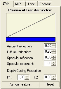 Hier hat der User die Möglichkeit, den Renderer für den geladenen Datensatz festzulegen. Zur Auswahl stehen "Direct Volume Rendering" (default) , Maximum Intensity Projection", "Tone Shading" und "Contour Rendering".