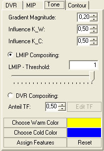 Des Weiteren hat der User die Möglichkeit zwischen LMIP Compositing und DVR Compositing zu wählen. Wählt er LMIP Compositing, so kann er den Intensity Threshold für das LMIP Compositing Model festzulegen (default: 1). Wählt er DVR Compositing, so hat er die Möglichkeit durch klick auf den Button "Edit TF" eine individuelle Transferfunction im sich dann öffnenden Dialogfenster zu erstellen. Die Farbe aus der Transferfunction wird dann beim rendern mit der Farbe aus dem Tone Shader gemischt. Den Anteil den die Transferfunction auf das Ergebnisbild haben soll lässt sich mit "Anteil TF" bestimmen.