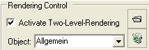 Hat der User ein oder mehrere Maskfiles geladen, so kann er durch klick auf die Checkbox "Activate Two Level-Rendering" Two Level Rendering einschalten. Durch klick auf das Open Icon kann ein neues Maskfile geladen werden, durch klick auf das Papierkorb Icon kann ein bereits geladenes Object entfernt werden. Das Object "Allgemein" ist am Anfang der gesamte Volumendatensatz, später, wenn Maskfiles geladen sind, nur noch jene Voxel, die in keinem der geladenen Maskfiles vorhanden sind.