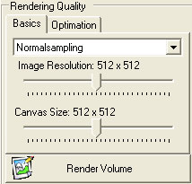 Ist wie dafaultmäßig "NormalSampling" aktiviert, ist das Verhältnis zwischen Image Resolution und Canvas Size immer 1:1. Bei "Supersampling 2" ist das Verhältnis 2:1. Analog ist das Verhältnis bei z. B."Subsampling 4" 1:4. Ist man mit den vorgenommen Einstellungen zufrieden, kann durch klick auf den Button "Render Volume" das Bild gerendert werden.