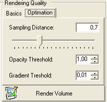 Hier kann der User die "Sampling Distance" einstellen, d.h. wie groß der Abstand von 2 benachbarten Raysamples auf einem Ray sein soll (default: 0.7). Des weiteren hat der User die Möglichkeit den "Opacity Threshold" zu bestimmen (default: 1.00) welcher den Schwellwert des Opacity - Wertes angibt, ab dem die "Early Ray Termination" stattfindet. Der "Gradient Threshold" (default: 0.01) gibt an, wie lang der Gradient des Raysamples mindestens sein muss, um das es in den weiteren Renderingprozess noch einzubeziehen. 0.01 bedeutet z. B. 1 % der maximalen Länge die der Gradient überhaupt annehmen kann, 0.20 bedeutet hingegen 20 % der maximalen Länge.