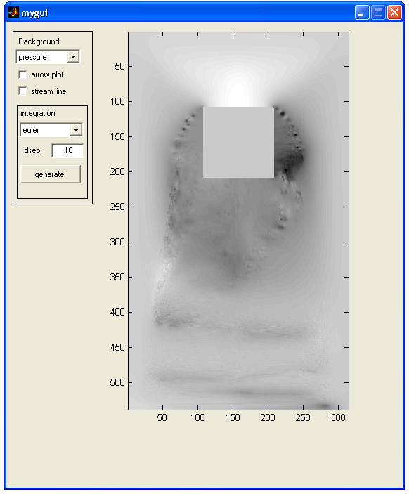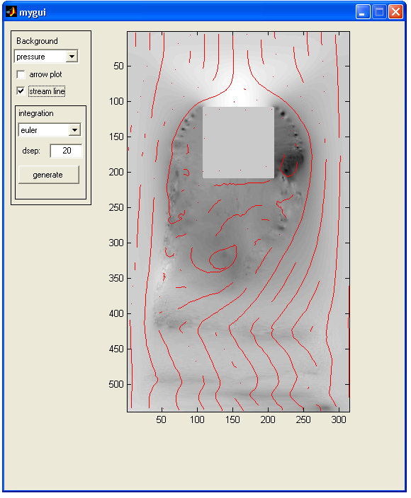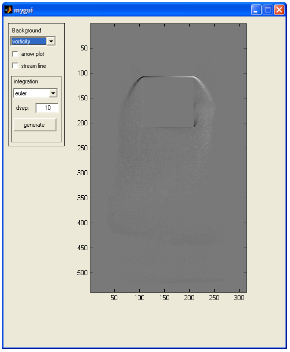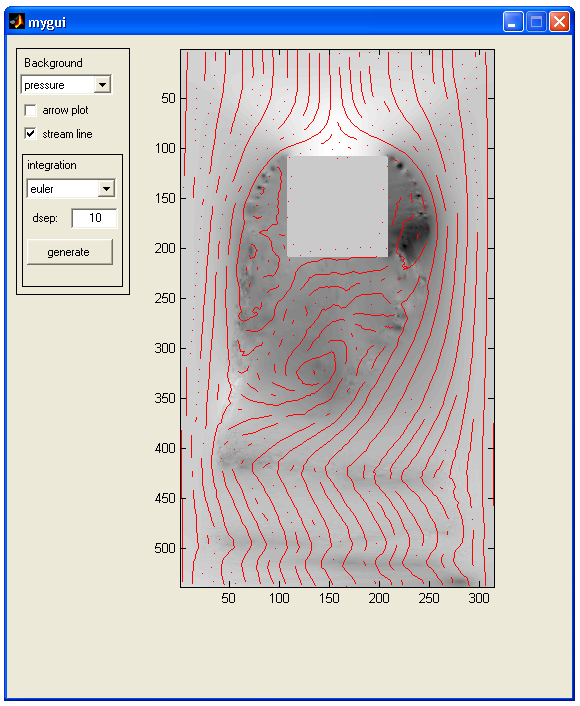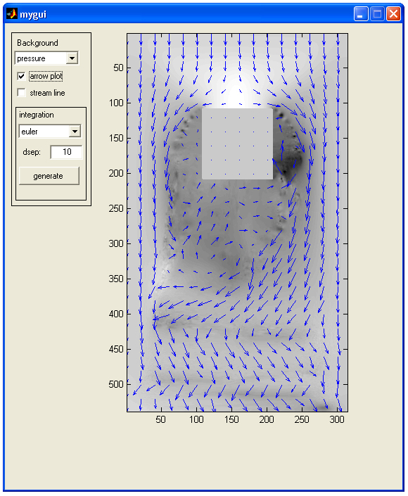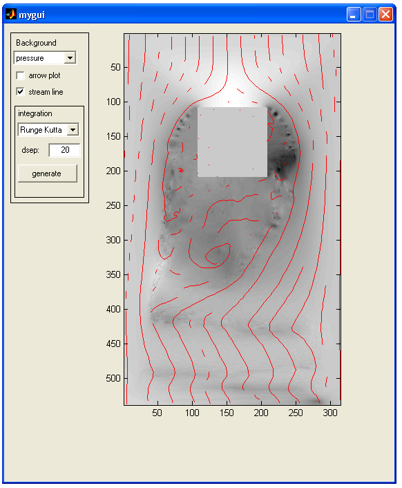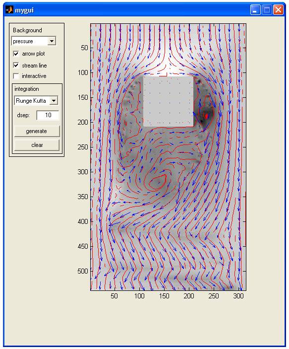 You cannot load an arbitrary data set. Its fixed to the block data. On the left you can select die background to be displayed (presure/vorticity). There are also two checkboxes toggling arrow plot / stream line display. Youn can choose integration method for stream line generation together with the dsep parameter. You first have to push the generate button in order to display the stream lines. Toggling interactive, you can click on the image and streamlines are added with die approprate method and dsep |