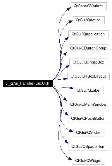 #include <QtCore/QVariant>#include <QtGui/QAction>#include <QtGui/QApplication>#include <QtGui/QButtonGroup>#include <QtGui/QGroupBox>#include <QtGui/QHBoxLayout>#include <QtGui/QLabel>#include <QtGui/QMainWindow>#include <QtGui/QPushButton>#include <QtGui/QSlider>#include <QtGui/QSpacerItem>#include <QtGui/QWidget>Include dependency graph for ui_transferFuncUI.h:
