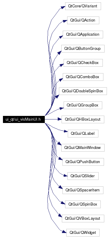 #include <QtCore/QVariant>#include <QtGui/QAction>#include <QtGui/QApplication>#include <QtGui/QButtonGroup>#include <QtGui/QCheckBox>#include <QtGui/QComboBox>#include <QtGui/QDoubleSpinBox>#include <QtGui/QGroupBox>#include <QtGui/QHBoxLayout>#include <QtGui/QLabel>#include <QtGui/QMainWindow>#include <QtGui/QPushButton>#include <QtGui/QSlider>#include <QtGui/QSpacerItem>#include <QtGui/QSpinBox>#include <QtGui/QVBoxLayout>#include <QtGui/QWidget>Include dependency graph for ui_visMainUI.h: