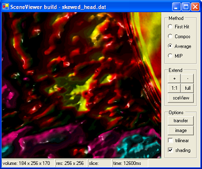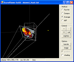 Mit dem Scene-Viewer lassen sich dreidimensionale Ansichten des Volumendatensatzes rendern. Es stehen vier verschiedene Visualisierungsmethoden für das Ray-Casting zur Verfügung: