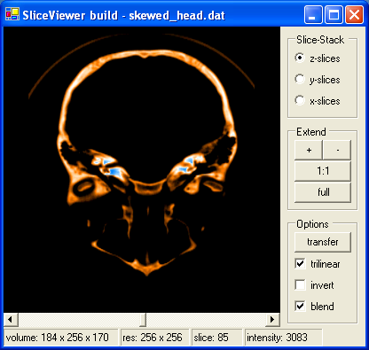 In der Statusleiste des Slice-Viewers werden Informationen über die Auflösung des Datensatzes, die Auflösung des gerenderten Bildes sowie die gerade eingestellte Slice angezeigt. Wird der Mauszeiger über das gerenderte Bild bewegt, zeigt die Statusleiste auch den Intensitätswert der Slice an der aktuellen Mausposition an. Wird der Intensitätswert '-1' angezeigt, befindet man sich außerhalb der Slice.