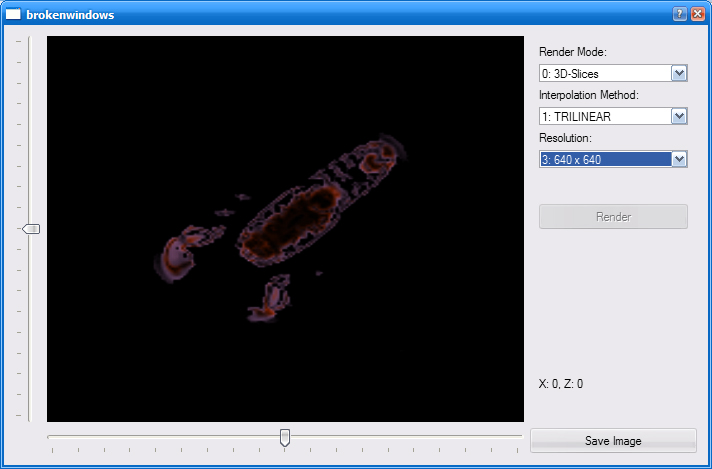 ![]() 1. Beschreibung der Elemente Links im Fenster befindet sich das große Rendering-Fenster, in dem dann das Objekt angezeigt wird. Die Slider links und darunter dienen zum Drehen der Kamera. Im rechten Rand des Fensters befinden sich die Steuerlemente zum Einstellen der Rendering-Parameter. 1. Slices anzeigen Ist für den Render Mode die Option "3D Slices" eingestellt, wird der jeweils aktuelle Slice des Objektes gezeichnet. Dieser Modus dient dazu, einen Überblick zu bekommen und das Objekt in die gewünschte Richtung zu drehen. 2. Rendering Mode ändern Die weiteren drei Rendering Mode Arten (Levoy, First Hit und Average) beschreiben jeweils andere Methoden des Ray Castings. Man sucht sich einen davon aus, der dann für das Rendering verwendet werden soll. 3. Interpolation Für die Interpolation gibt es zwei Möglichkeiten: Nearest Neighbour und Trilinear. 4. Auflösung Als dritten Rendering-Parameter kann man angeben, mit welcher Auflösung das Ray Casting durchgeführt werden soll. 5. Rendering starten Der Button "Render" startet das Rendering. Es erscheint dann ein Fortschrittsbalken und das Bild wird stufenweise von links nach rechts aufgebaut. 6. Bild speichern Der Button "Save Image" speichert das aktuelle Bild in dem Ordner, in dem das Programm ausgeführt wird. |