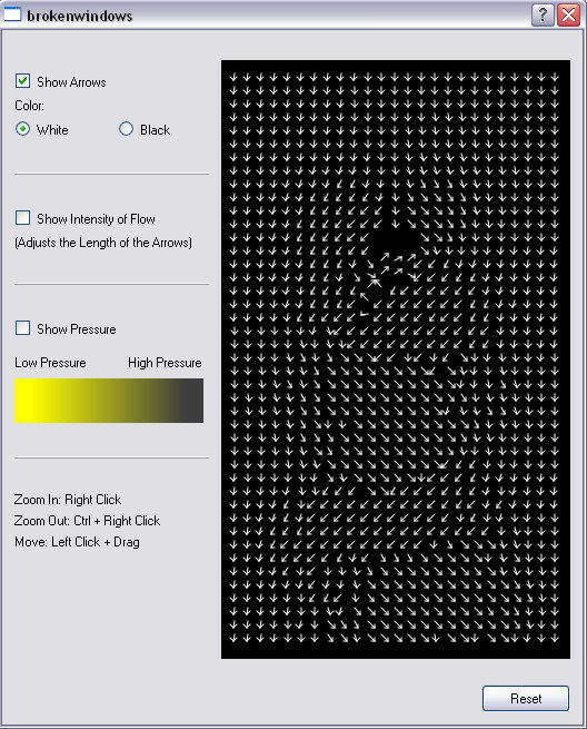 ![]() 1. Pfeile anzeigen Diese Option ist beim Start automatisch eingeschalten. Durch Wegklicken werden die Pfeile ausgeblendet, was z.B. nützlich sein kann, wenn man nur die Farbwerte der Druckwerte (siehe weiter unten) betrachten möchte. Zusätzlich kann man hier noch die Farbe der Pfeile aussuchen, nämlich ob diese schwarz oder weiß dargestellt werden sollen. 2. Stärke der Strömung anzeigen Die Stärke der Strömung ist durch die Länge der Pfeile kodiert. Beim Start sind alle Pfeile gleich lang, aber durch Aktivieren der zweiten Checkbox wird ihre Länge der Strömungsstärke angepasst. 3. Druckwerte anzeigen Der Druck der Strömung ist durch Farben kodiert - welche, das wird in dem Farbbalken unter der Checkbox angezeigt. Durch Aktivieren der Checkbox werden die entsprechenden Farben angezeigt (falls Pfeile vorhanden sind, passiert das im Hintergrund und die Pfeile bleiben im Vordergrund). 4. Zoomen und Verschieben Diese Funktionen sind durch folgende Tasten und Mausklicks aufrufbar: Hineinzoomen: rechte Maustaste Herauszoomen: Taste Ctrl gedrückt halten plus rechte Maustaste Verschieben: linke Maustaste gedrückt halten und ziehen 5. Reset Button Ein Klick auf den Button "Reset" setzt den Arrow Plot auf seine Startwerte zurück. |