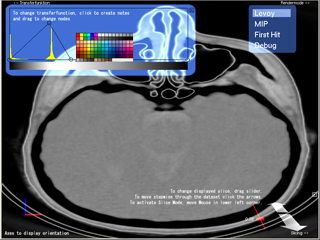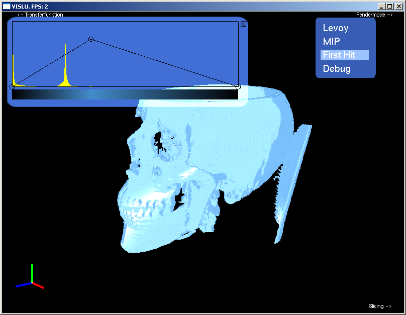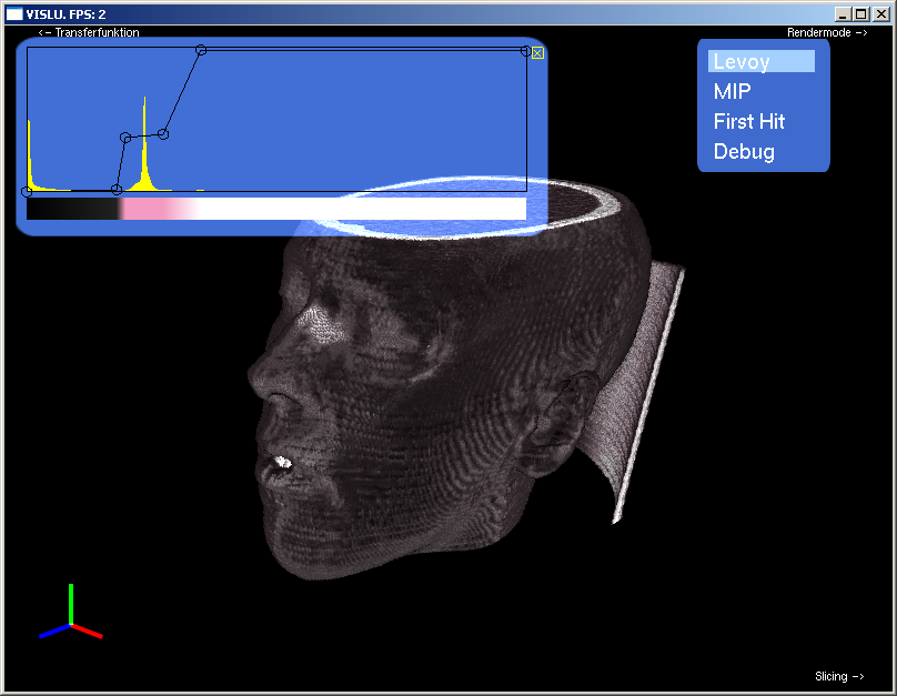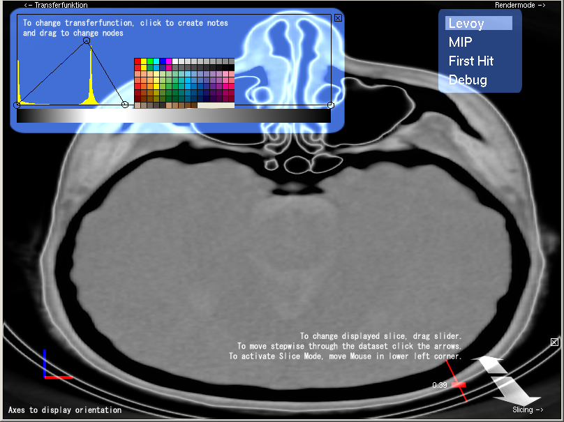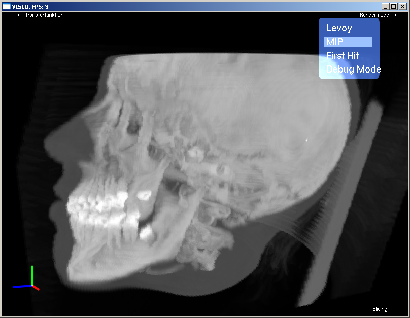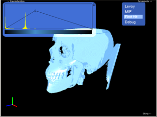 The Render Mode Element allows you to change the rendering mode. First Hit Rendering shows the voxel on the entry position of the ray, depending on the chosen density value. MIP (Maximum intensity projection) shows the voxel with the maximum intensity and Levoy Mode performs compositing as proposed in his paper "Display of Surfaces from Volume Data".