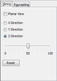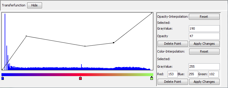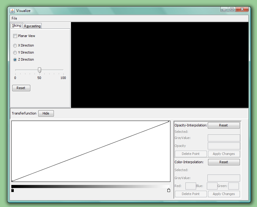 Slicing:Ist im linken, oberen Panel der Tab 'Slicing' aktiviert, so sieht der Benutzer folgenden Inhalt in diesem Panel:![]() Das wichtigste Element in diesem Panel sind die Radiobuttons 'X Direction', 'Y Direction', 'Z Direction' und der Slider. Mit dem Slider kann der Benutzer durch den Datensatz hindurchfahren und durch die Auswahl eines der vorher genannten Radiobuttons kann er die Richtung dieser Fahrt bestimmen. Durch Aktivierung der Checkbox 'Planar View' wird festgelegt, dass sich die Größe des angezeigten Datensatzes nicht ändern soll und der Datensatz auf einer Ebene, die parallel zum Bildschirm verläuft abgebildet werden soll. Ist diese Checkbox nicht aktiviert, so wird die Ebene beim Slicing perspektivisch verzerrt. Wenn der Benutzer die Perspektive / Blickrichtung verändert hat und diese Änderungen rückgängig machen möchte, so muss er den 'Reset'-Button drücken. Raycasting:Ist anstatt des Tabs 'Slicing' der Tab 'Raycasting' aktiviert, so sieht der Inhalt des Panels folgendermassen aus:![]() Hier hat der Benutzer die Möglichkeit zwischen Raycasting und der 'Maximum Intensity Projection' durch Betätigung auf die Checkbox 'MIP' umzuschalten. Weiters kann er die Genauigkeit des Renderns (Stepsize) über einen Slicer zu regulieren. Transferfunktion:Im unteren Panel befindet sich die Transferfunktion.![]() Diese kann durch einen Klick auf den 'Hide'-Button versteckt und anschließend wieder angezeigt werden. Die Transferfunktion beinhaltet ein Panel, in dem der User die Opacity der Farbwerte eines Datensatzes bearbeiten kann. Die Opacity wird hierbei durch Punkte, die durch Linien verbunden sind dargestellt. Weiters wird im Hintergrund ein Histogramm angezeigt, das die Häufigkeit der einzelnen Farbwerte darstellt. Der User kann hier Punkte hinzufügen, selektieren, verändern und entfernen. Wird die 'Strg'-Taste gedrückt gehalten und in das Panel geklickt, so wird ein neuer Punkt hinzugefügt. Wird ein Punkt angeklickt, so wird er selektiert und die Werte des Punktes werden in daneben stehenden Textfeldern angezeigt. Der Benutzer kann die Werte des Punktes durch Ändern der Werte in den Textfeldern verändern und durch ein Draggen des Punktes. Selektierte Punkte werden durch einen Klick auf den Button 'Delete Point' entfernt. Unter dem Panel für die Opacity befindet sich ein Panel in dem man die Farbwerte des Datensatzes auf andere Farbwerte abbilden kann. Die Benutzereingaben für dieses Panel sind mit den Benutzereingaben im Opacity-Panel identisch. Die Farbwerte eines Punktes (der in Form eines Schiebereglers angezeigt wird) können über daneben stehenden Textfelder verändert werden und weiters über einen Doppelklick auf den Schieberegler. In beiden oben genannten Panels können die gemachten Veränderungen durch einen Klick auf die zugehörigen "Reset'-Buttons zurückgesetzt werden. Weiters besteht die Möglichkeit Transferfunktionen zu speichern (Menü und zu öffnen. |