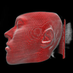Woodgrain artifacts can be removed with stochastic jittering. For each ray the start position is moved a little bit by a value gained from a noise texture in the view direction. The offset ranges from zero to a half sampling step (forward or backward) and is multiplied with the value defined in the field Stochastic jittering. Hence, when the value for stochastic jittering is set to zero, the volume is sampled at regular intervals.