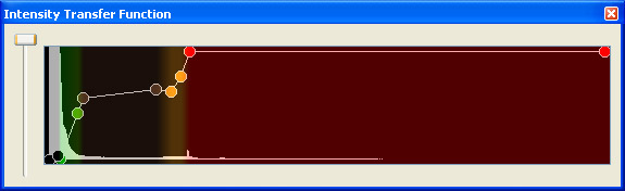 The window for defining the transfer function shows the histogram of the currently loaded volume. For transfer functions used for the gradient magnitudes, the histogram of gradient magnitudes is shown. The histogram can be scaled with the slider left to the transfer function.