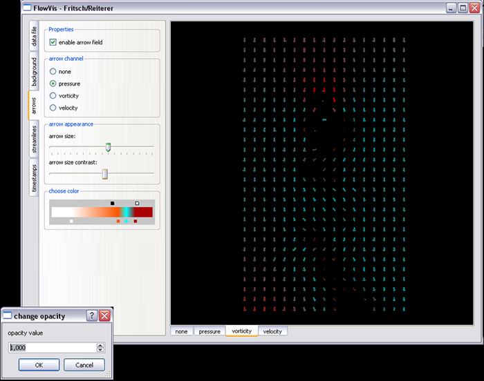 Um einen Arrowplot erstellen zu können, wird dieser Tab ausgewählt. Es kann wie beim Background für jeden Channel die Farbe der Arrows ausgewählt werden. Zusätzlich gibt es noch zwei Sliders mit denen die Größe und die Distanz zwischen Arrows verändert werden kann. Hier gibt es beim ColorWidget weiters die Möglichkeit die Opacity zu setzen. Hiermit wird ein Bereich selektiert, mit welchem nur die interessanten Aspekte hervorgehoben werden können.
