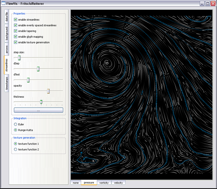 Wir haben neben dem "normalen" Algorithmus den Evenly Spaced Streamlines Algorithmus implementiert. Dieser verteilt die Streamlines gleichmäßig. Um die Position für die Streamlines schneller berechnen zu können, haben wir einen weiterern Suchalgorithmus implementiert, der das Grid in Zellen unterteilt. Die Darstellung kann durch tapering, glyph mapping oder texture generation verändert werden. Wie gehabt kann man eine Farbe und die Opacity wählen. Auch können Parameter für die Berechnung der Streamlines verändert werden wie z.B. die stepsize oder für die evenly spaced streamlines dtest sowie dsep. Für texture generation wurden zwei verschiedene Texturen erstellt.