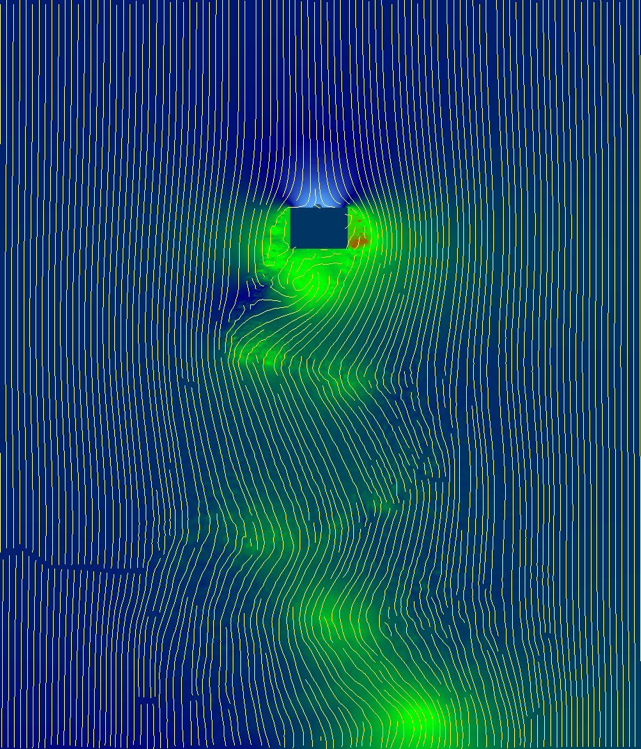 Block with color-coding of pressure and lots of streamlines (without tapering)