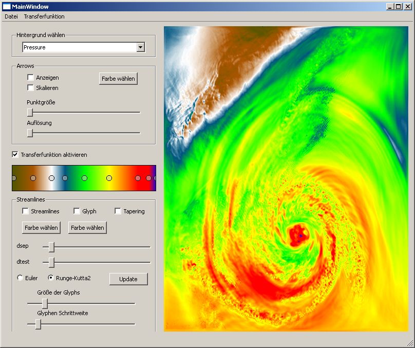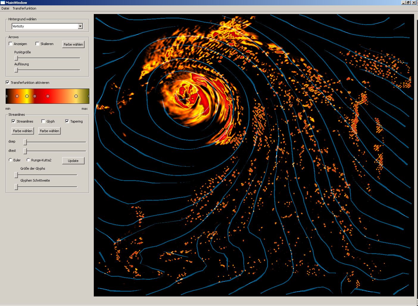 Hurrican mit Vorticity-Color-Coding und Streamlines