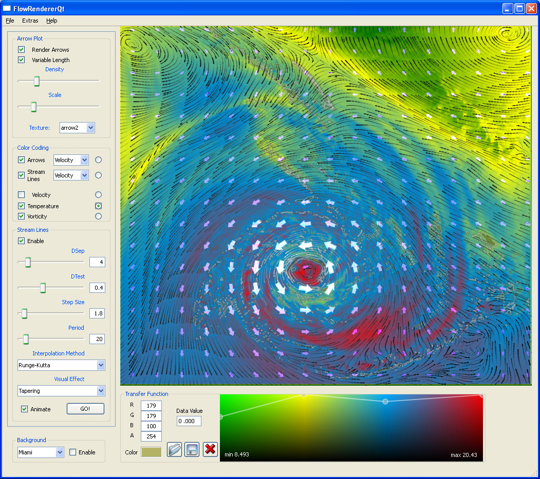 In diesem Bereich werden die Berechnung und Visualisierung der Strömungslinien konfiguriert. Bei DSep und DTest und StepSize handelt es sich um Parameter des verwendeten Algorithmus. DSep ist die Standarddistanz zwischen zwei Strömungslinien, DTest ein anteiliger Wert von DSep, um wieviel die Distanz unterschritten werden darf und bei StepSize handelt es sich um den Abstand zweier aufeinander folgender Punkte der gleichen Strömungslinie. Idealerweise ist die StepSize etwas größer als DSep • DTest. Der Wert Period bestimmt bei Animation bzw. Verwendung des Texturing-Effekts deren Abstand. Zusätzlich kann noch die verwendete Interpolation zwischen Euler und Runge-Kutta 2. Ordnung umgeschalten, sowie Tapering und Glyph-Mapping ausgewählt werden. Bei Glyph-Mapping lassen sich die Pfeile durch den "Scale"-Regler im "ArrowPlot"-Bereich in der Größe ändern. Ein Klick auf GO! startet die Berechnung, ein weiterer stoppt sie und bringt das bislang berechnete Ergebnis auf den Bildschirm.