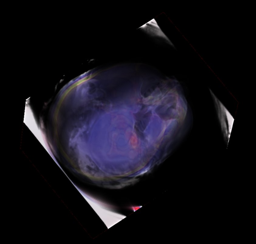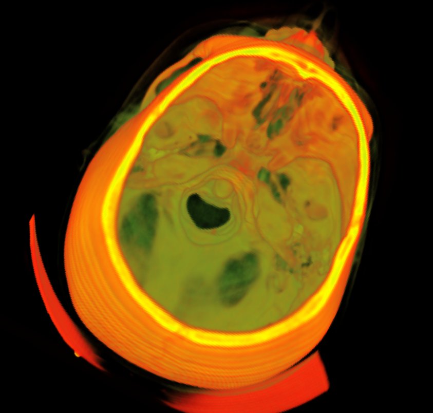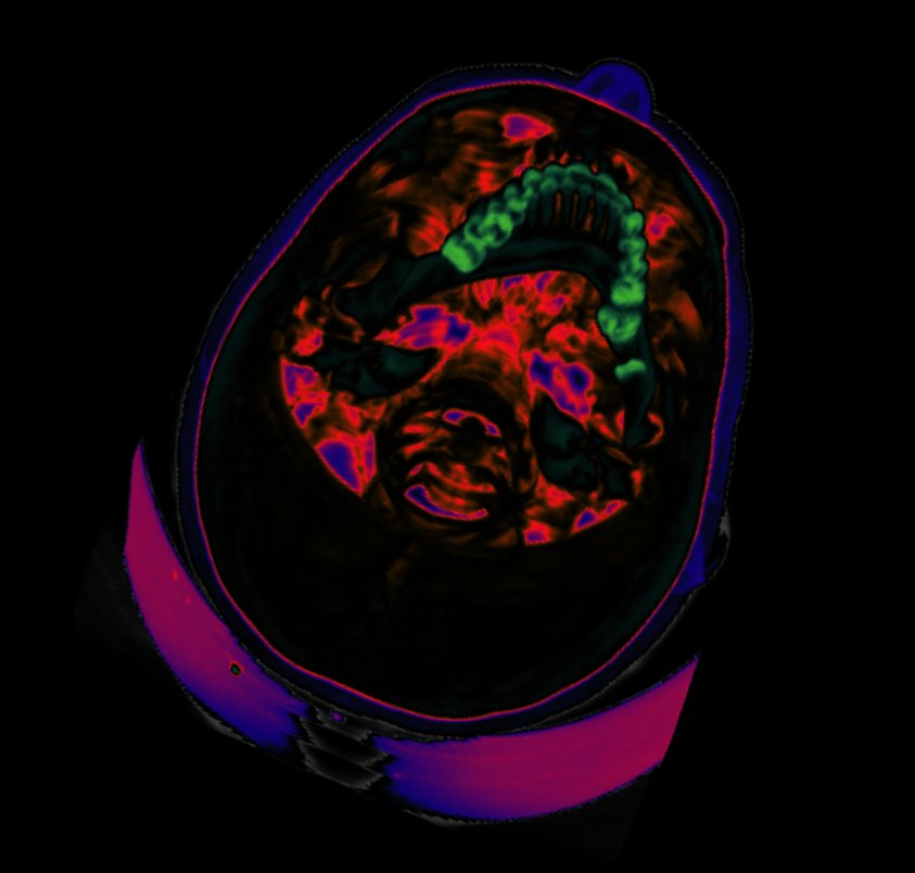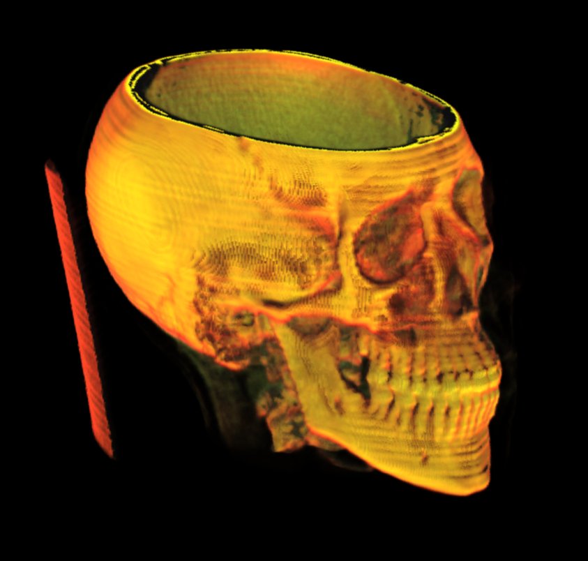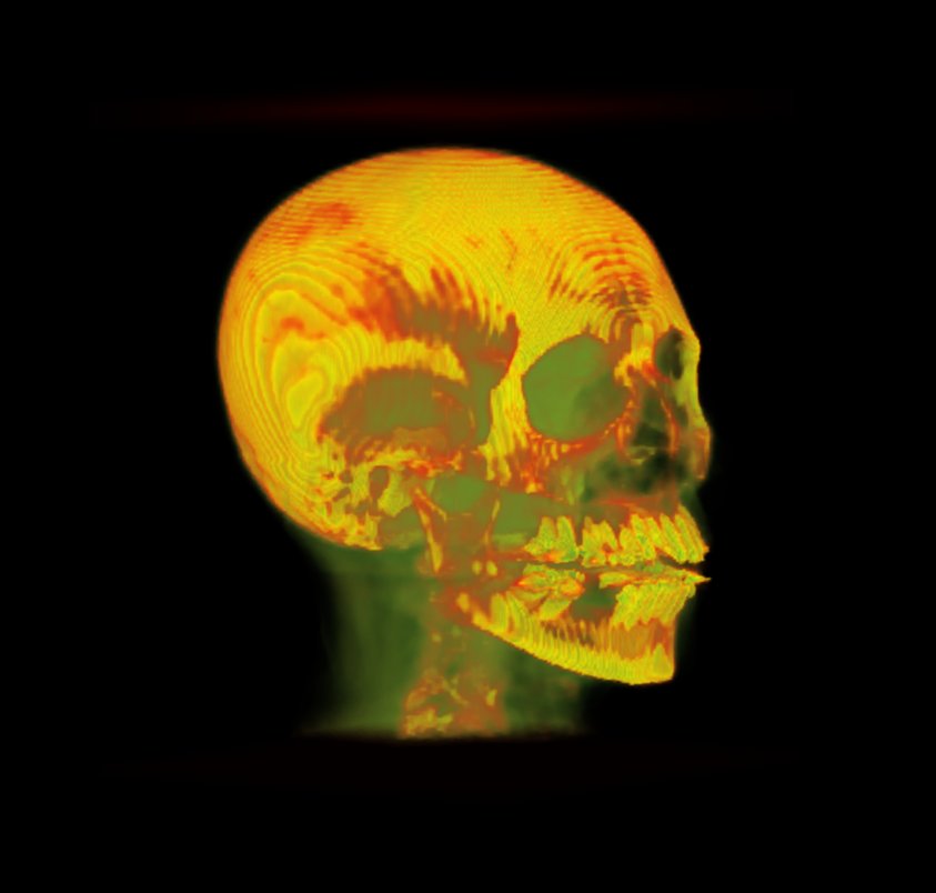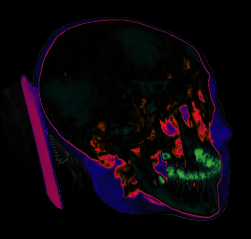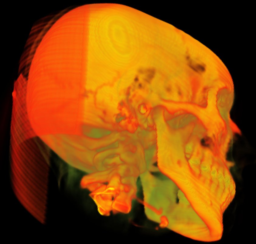 Bilder (v.l.n.r.): 2 Rotierte Bilder des Skewed Heads mit trilinearer Interpolation und Post Processing, Geänderte Transferfunktion, Clipping in pos. x-Richtung von 0,5