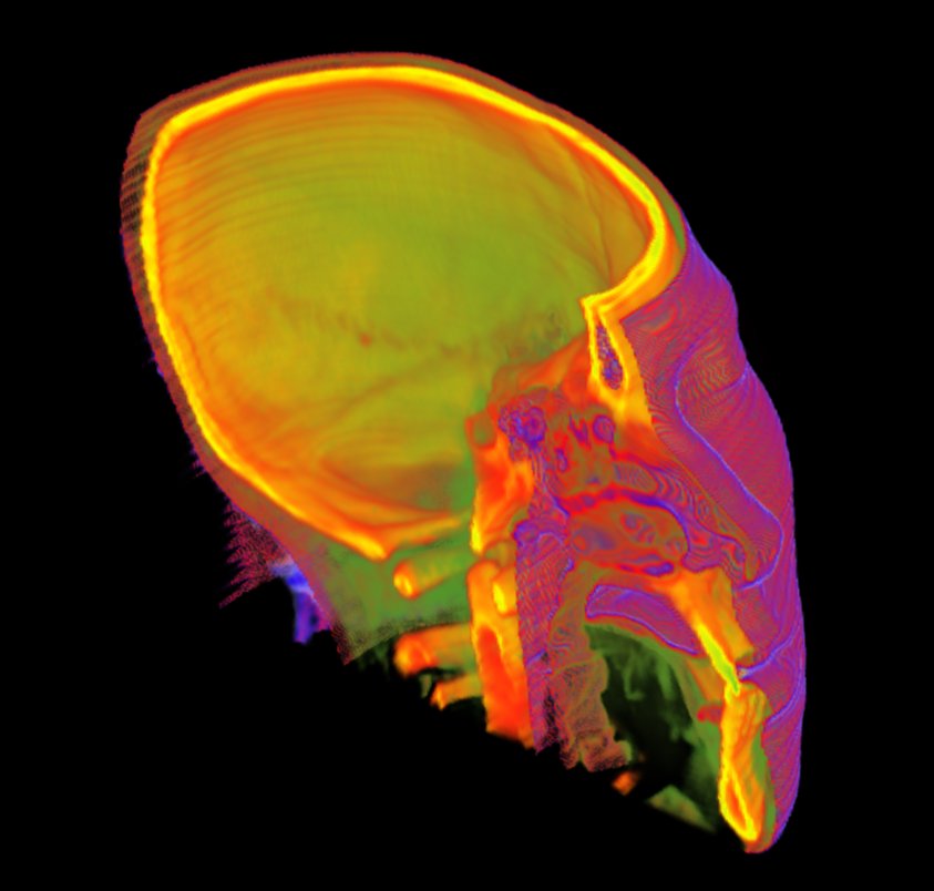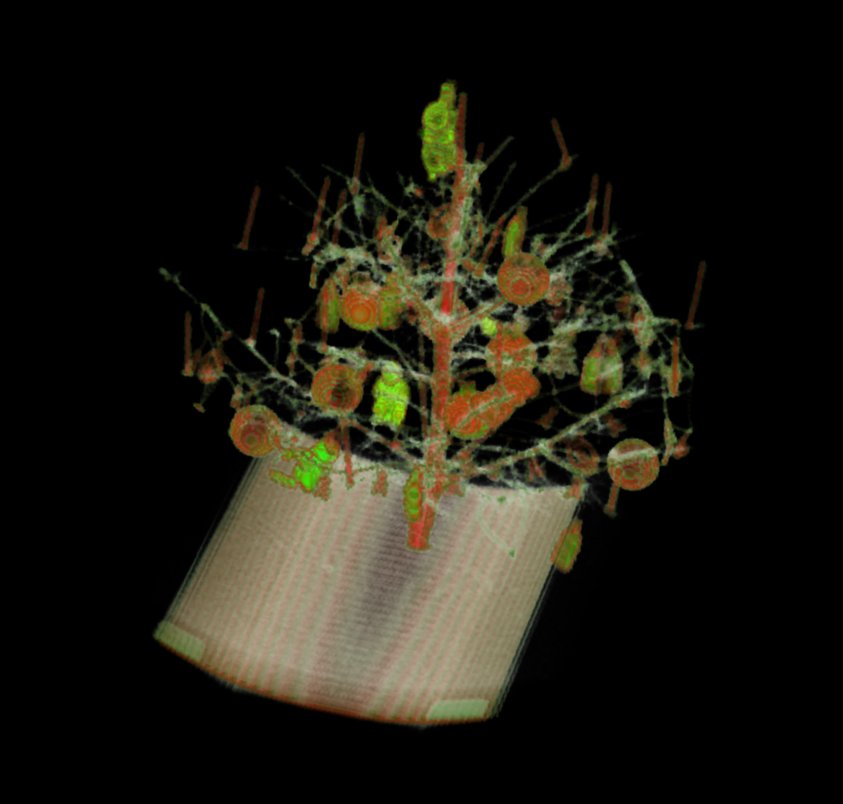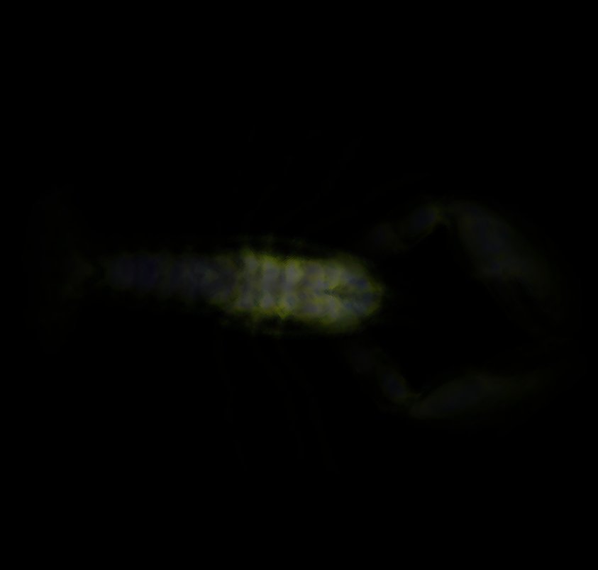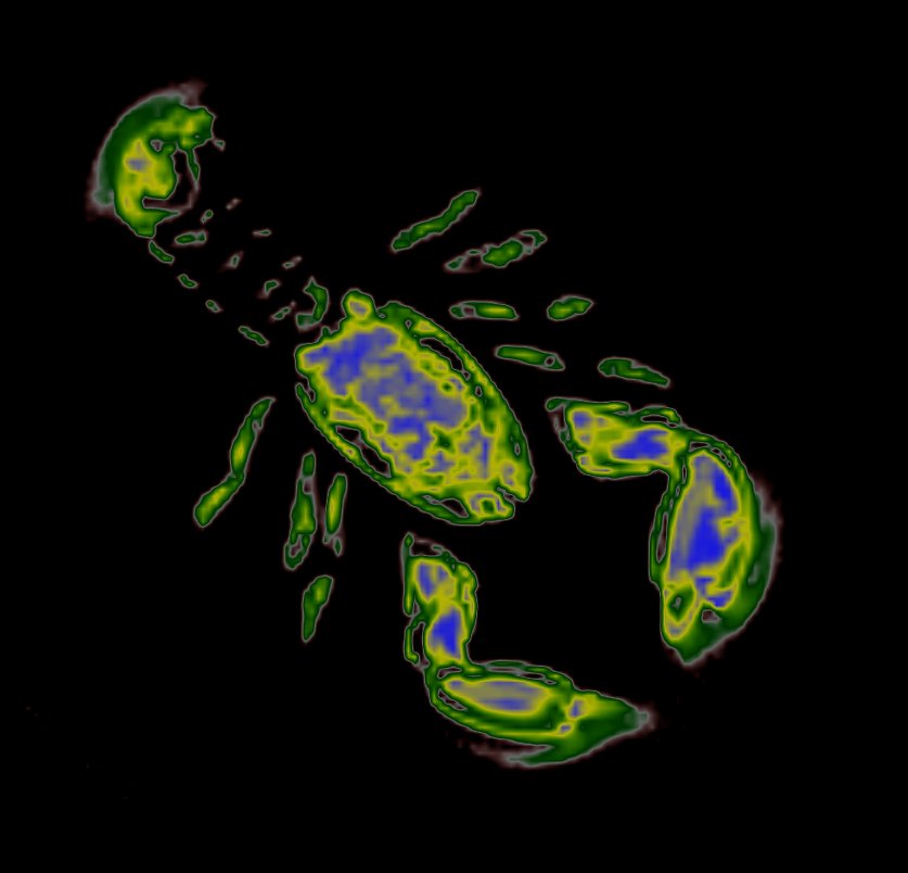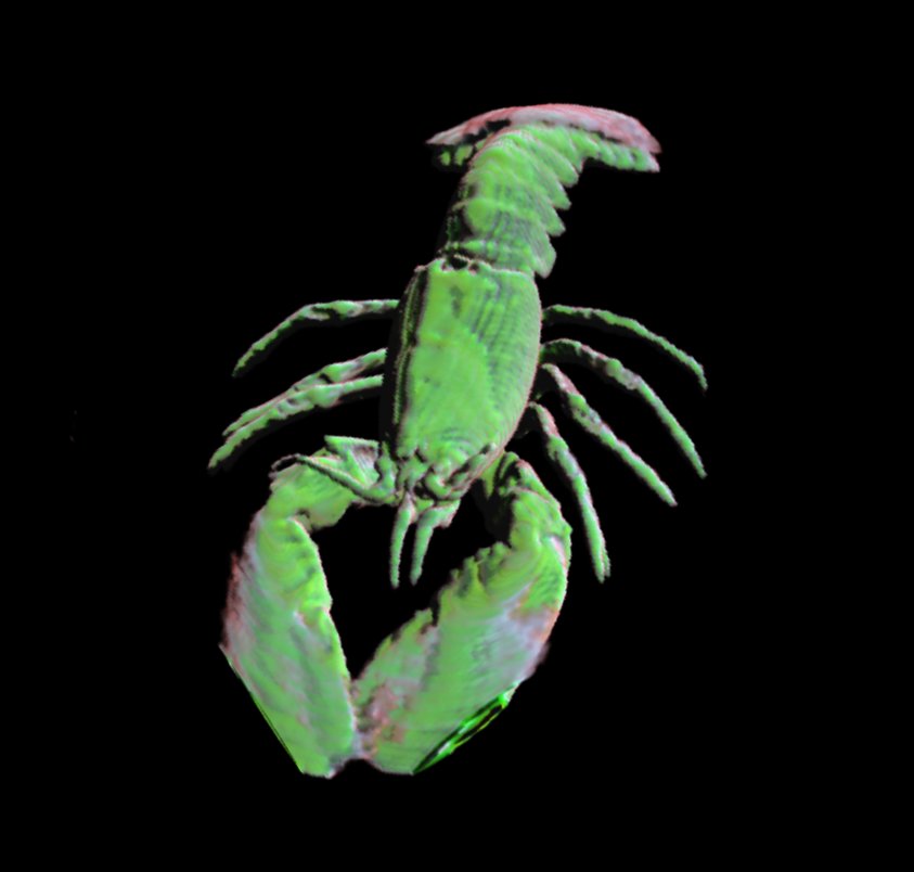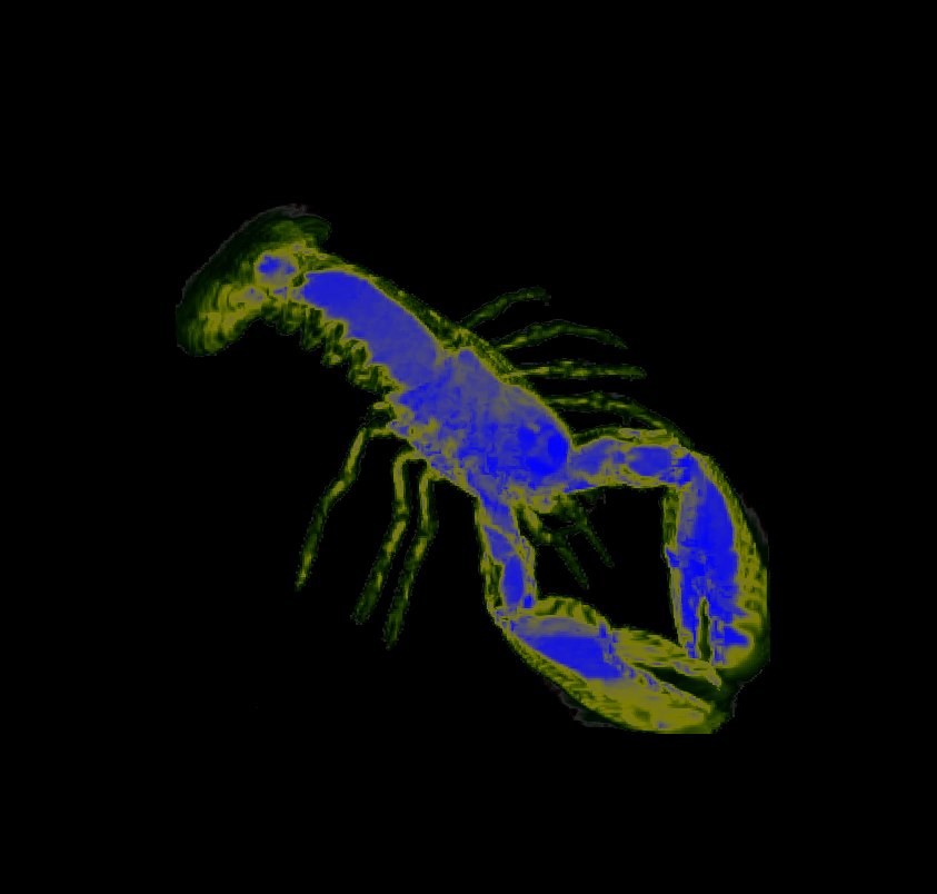 Bilder (v.l.n.r.): Beleuchteter Lobster (postprocessed), MIP-Lobster, Xray-Lobster, X-mastree (postprocessed)