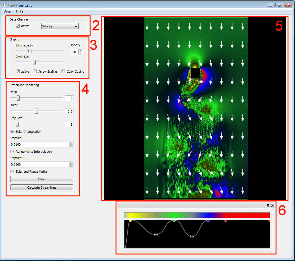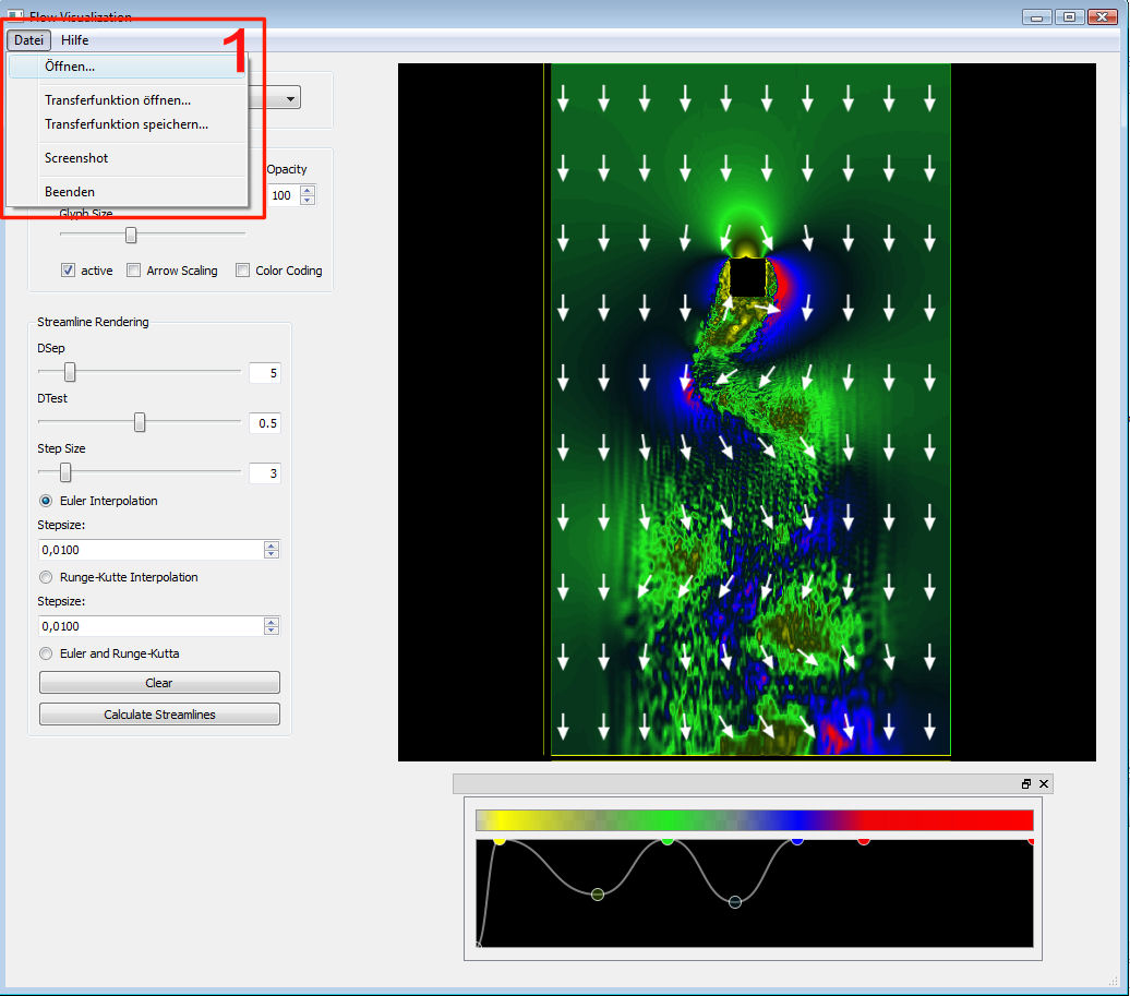Über den Menüpunkt (1) Datei -> Öffnen... startet ein Dialog zum Auswählen eines Strömungsdatensatzes. Dieser wird im aktuell aktiven Rendering Modus dargestellt. Weiteres kann hier eine gespeicherte Transferfunktion geladen und gespeichert sowie ein Screenshot vom aktuellen Strömungsfeld erstellt werden.