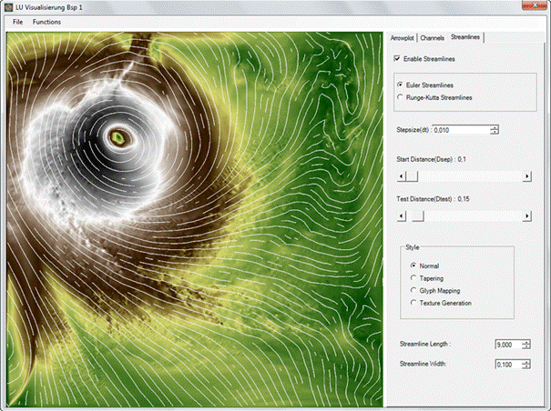 Im Streamline Tab kann man zwischen dem Euler- und Runge-Kutta-Integrationsvarianten wechseln, und die für den Algorithmus wichtigsten Parameter dt(Stepsize), dsep(Start Distance bzw Seperating Distance) und dtest(Test Distance) einstellen. Zusätzlich kann man Breite und Länge der Streamlines einstellen, und als Visualisierungstill Tapering einschalten.