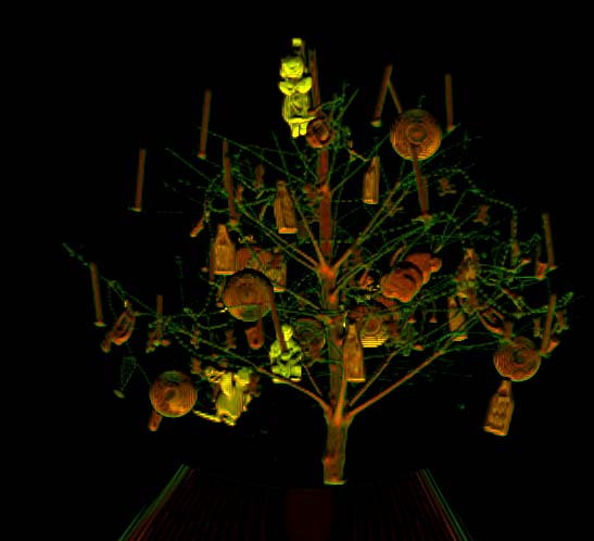 CT-scan von einem geschmückten Weihnachtsbaum. Die Größe des Volumens ist x=256 y=256 z=249. XMasTree Datensätze in höherer Auflösung sowie mehr Informationen über den XMasTree kann man auf der XMasTree Homepage finden. |