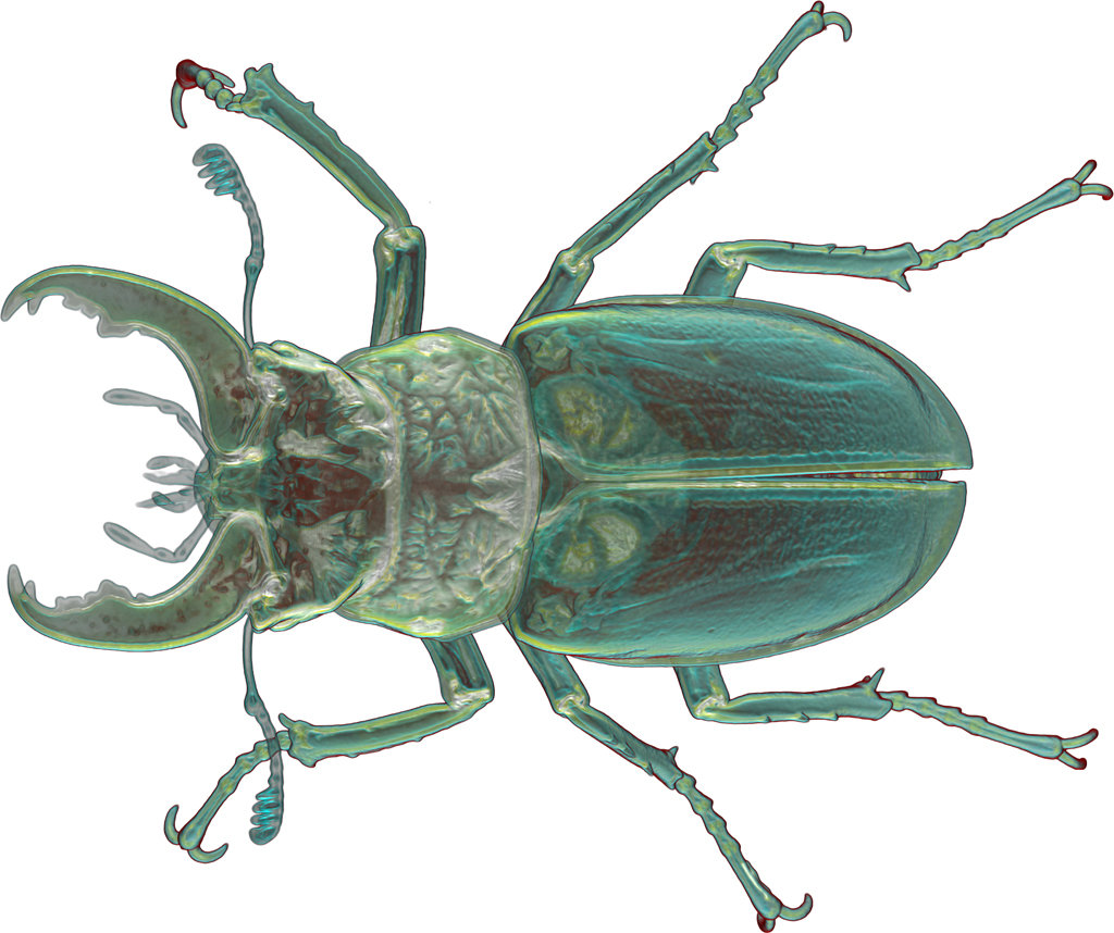 CT-scan von einem Hirschkäfer. Volumengröße: x=277, y=277, z=164 Voxels. Mehr Informationen über den stagbeetle und Datensätze in anderen Auflösungen kann man auf der Stagbeetle Homepage finden. |