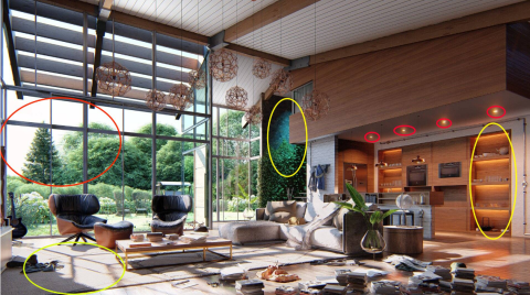 Light-source estimation example. Red: Areas with high intensity that can be modeled as light sources. Yellow: indirect lighting shows the direction to a light source. Having both geometry and images allows us to estimate the origin of such phenomena. Source: Lumion via X