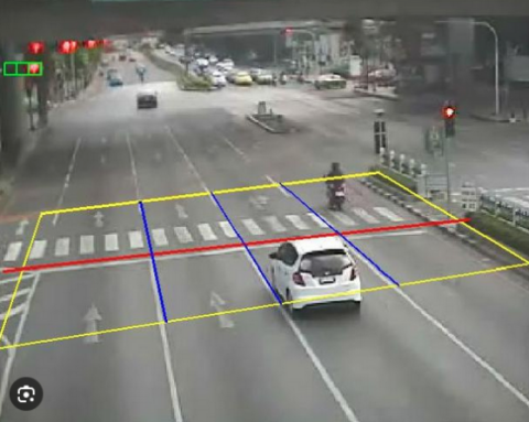 This requires (pre-trained) neural network models to detect entities in the vicinity of the vehicle, including vehicles, traffic signs, and traffic lights, as well as street markings (e.g., lanes) and street boundaries such as curbs. In addition to static detections such as being across a non-cross line, temporal analysis is important to detect red light runs, too close driving (which also depends on speed), and other time-dependent violations of traffic signs.